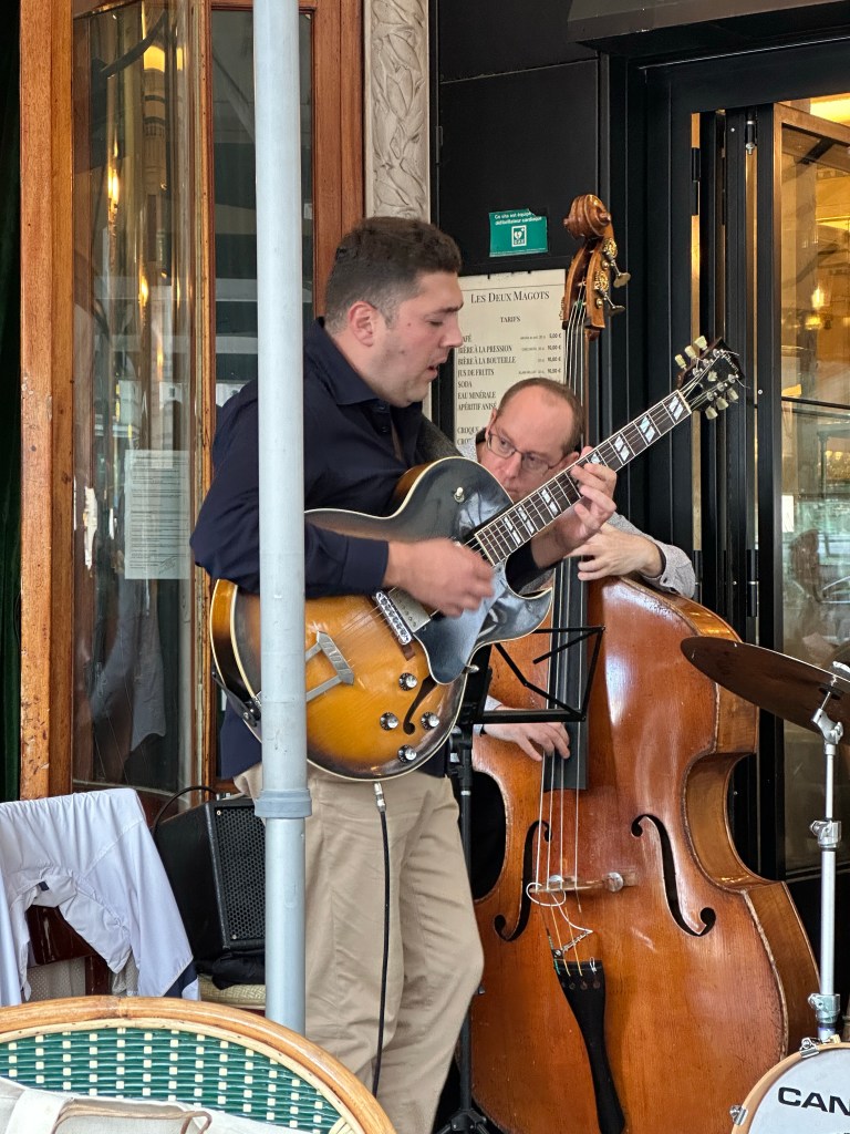 At Les Deux Magots, it’s 5pm and the jazz band starts. They are folded into a corner by the doorway, a spontaneously formed group who had nothing better to do on a Monday evening as Parisians returned to the capital after escaping the oppressive heat of August.