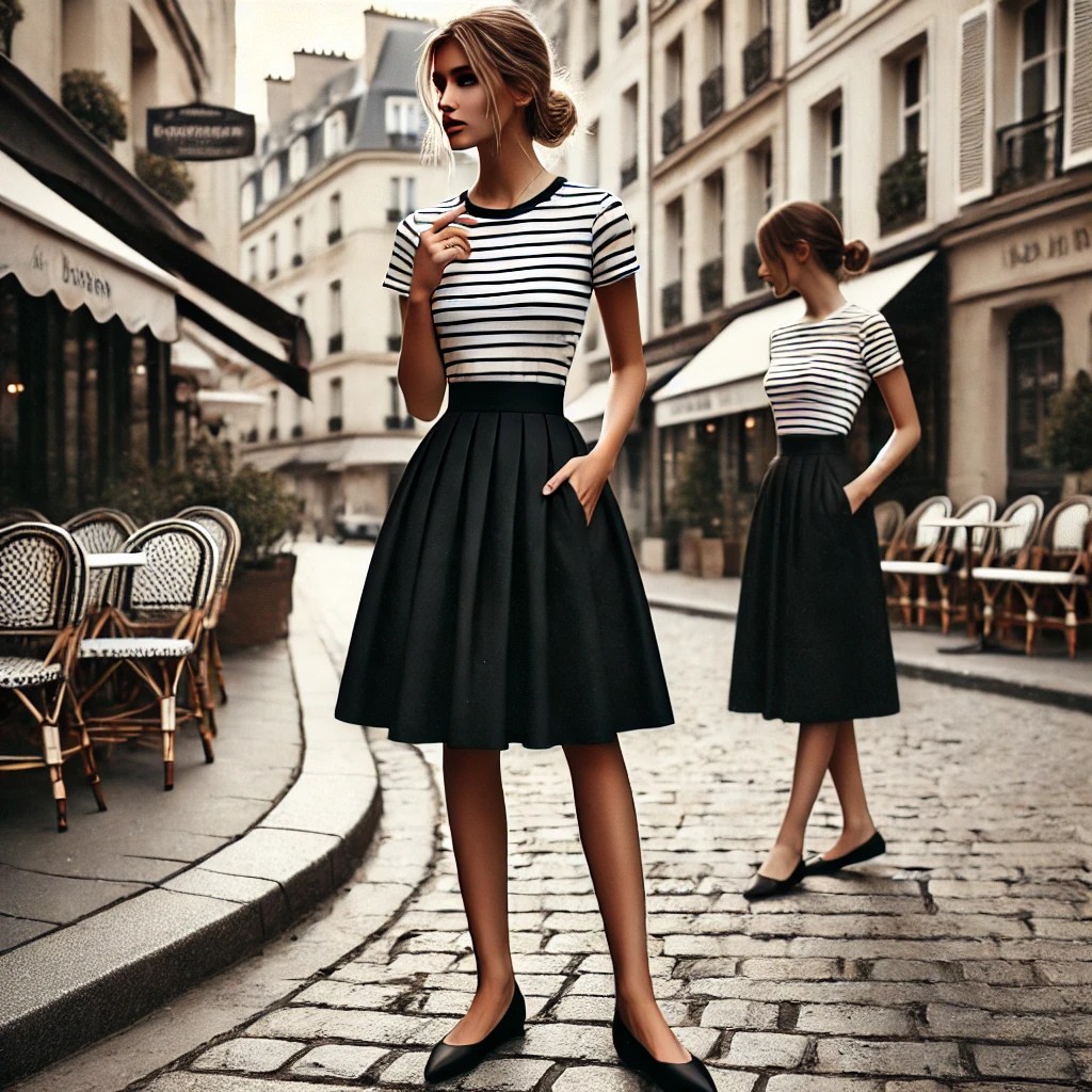 Using voice command, I asked Chat GPT to create me an image of what I imagined her outfit to be: Parisian inspired, black and white striped tee with a black skirt coming to under the knee, paired with black ballet flats.